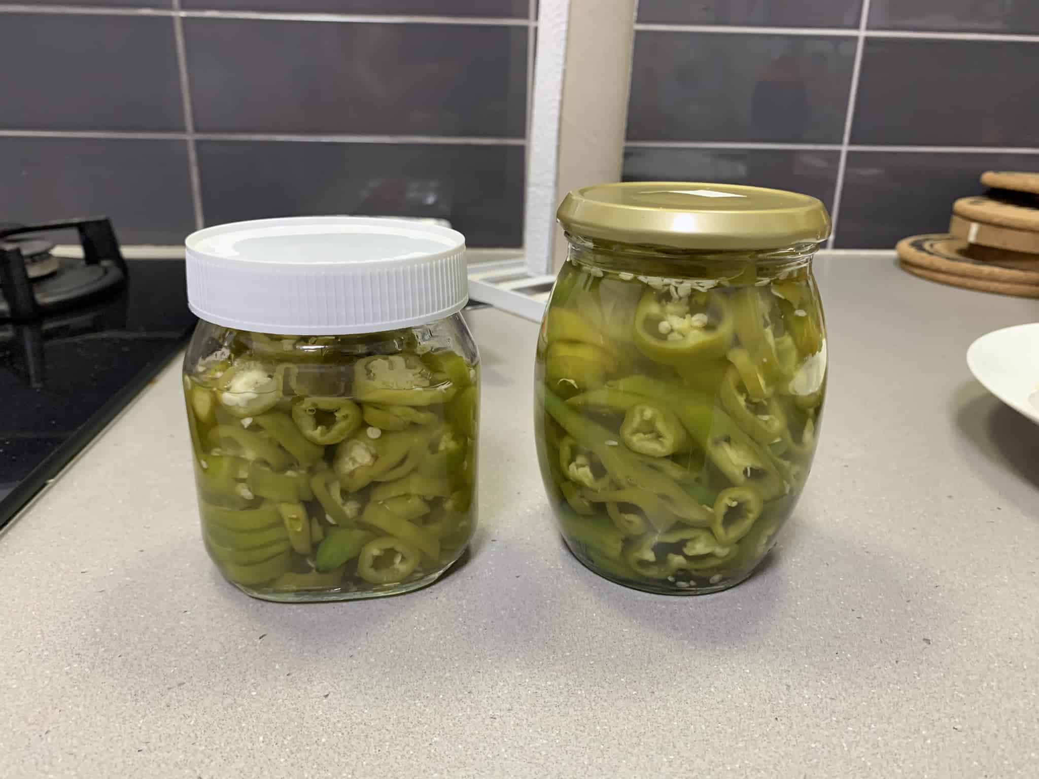 לחתוך כ- 12 פלפל ירוק חריף לפרוסות דקות ולהוסיף לנוזלים