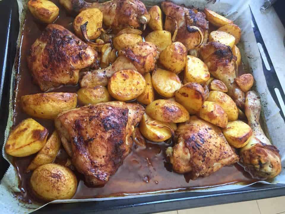 לשים בקערה את העוף, תפוחי אדמה קטנים, בצל גדול וכמה שיני שום